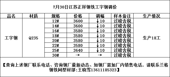 • 7月30日江苏正祥工字钢挂牌价下调10元