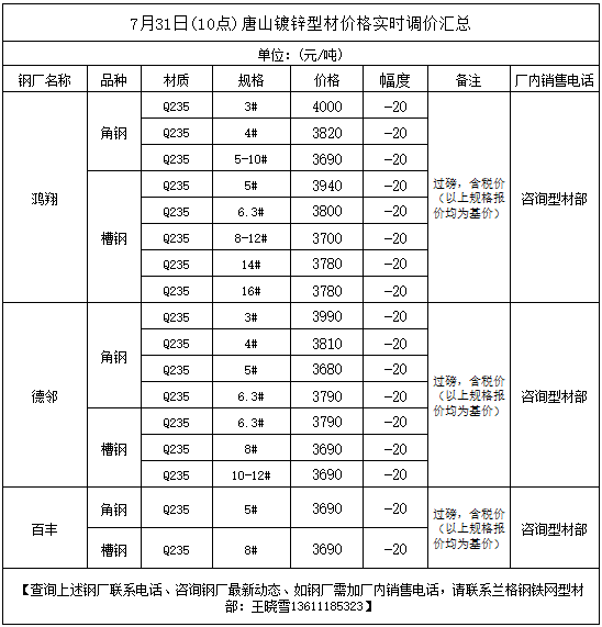7月31日(10点)唐山镀锌型材价格实时调价汇总