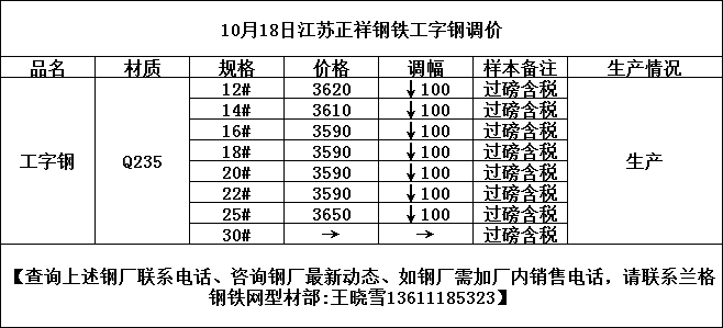 • 10月18日江苏正祥工字钢挂牌价下调100元
