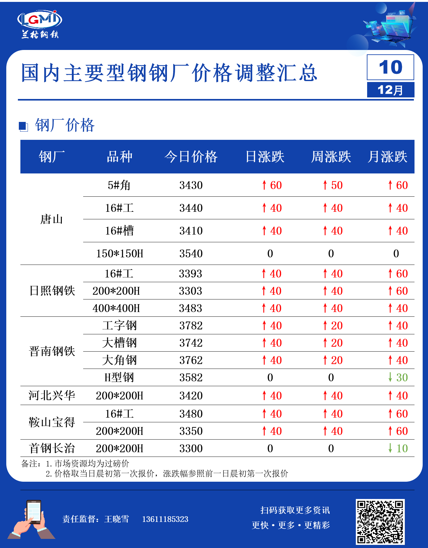 • 12月10日(9点)唐山型钢厂角钢实时调价汇总
