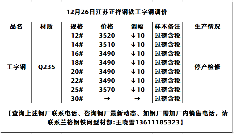 • 12月26日江苏正祥工字钢挂牌价下调10元