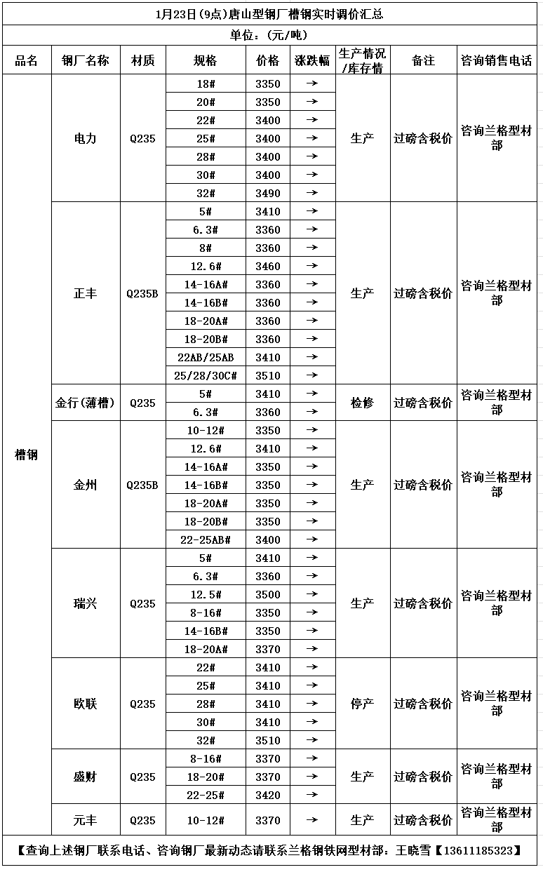 • 1月23日(9点)唐山型钢厂槽钢实时调价汇总