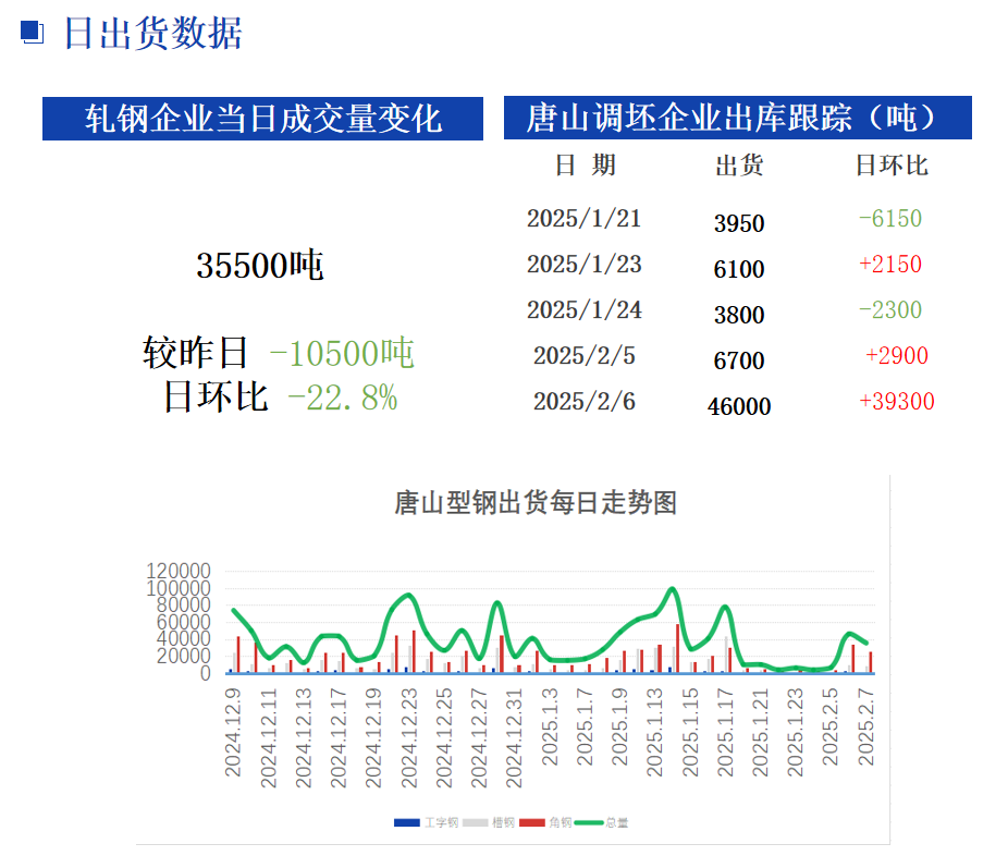 兰格调研:据统计截止16:30唐山24家型材钢厂出货总量约35500吨,较上一交易日降幅22.8%,其中工字钢1600吨;槽钢8500吨;角钢25400吨。