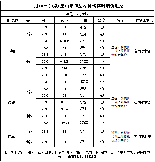 • 2月10日(10点)唐山镀锌型材价格实时调价汇总