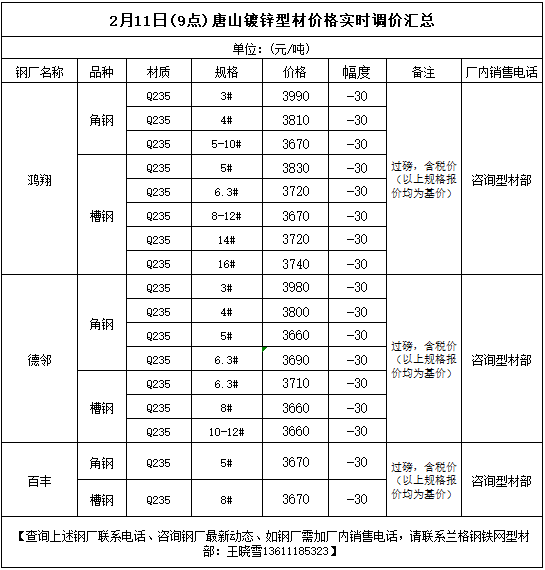 • 2月11日(9点)唐山型钢厂角钢实时调价汇总