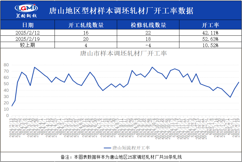 兰格钢铁网统计唐山24家样本轧钢企业共38条轧线,在产20条,停产18条,停产轧线数较上周统计减少4条,开工率为52.63%,较上周上升10.52%。
