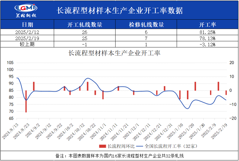 截至2月19日16:00,兰格钢铁网统计国内16家长流程样本生产企业共32条型钢轧线,在产25条,停产7条,开工率为78.13%,较上周下降3.13%。
