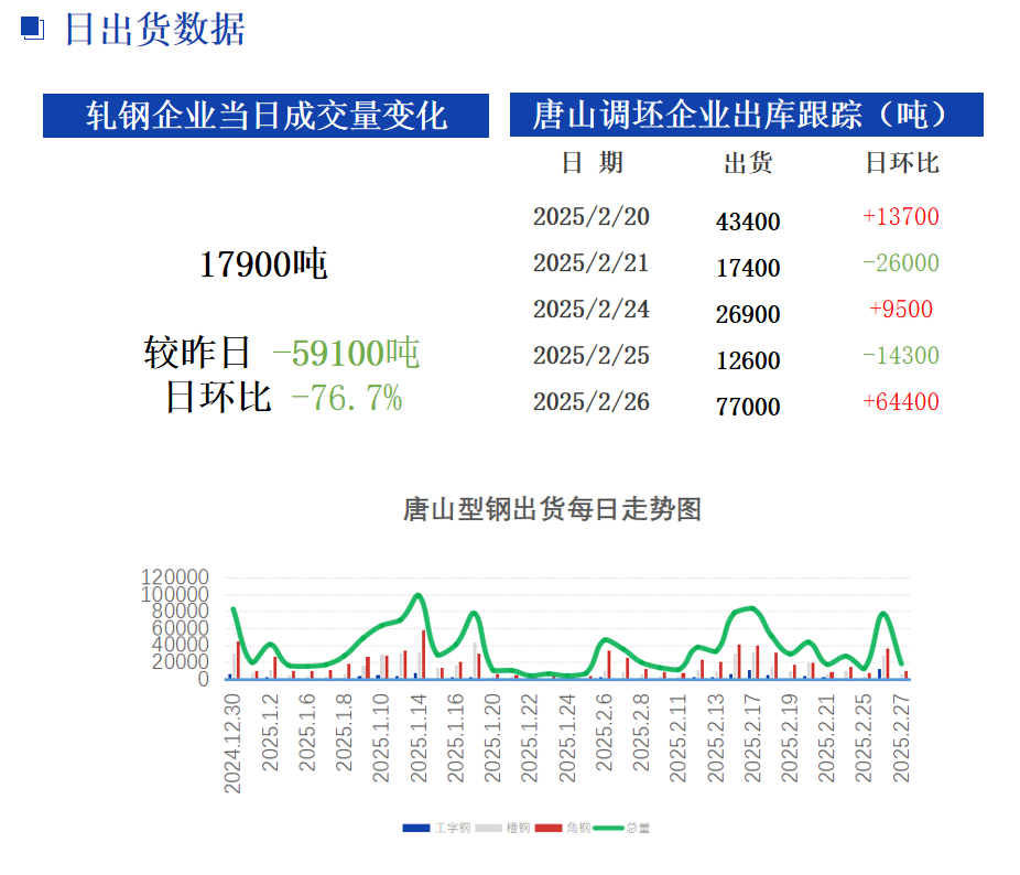 兰格调研:据统计截止16:30唐山24家型材钢厂出货总量约17900吨,较上一交易日降幅76.8%,其中工字钢1500吨;槽钢6400吨;角钢10000吨。