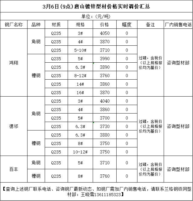 • 3月6日(10点)唐山镀锌型材价格实时调价汇总