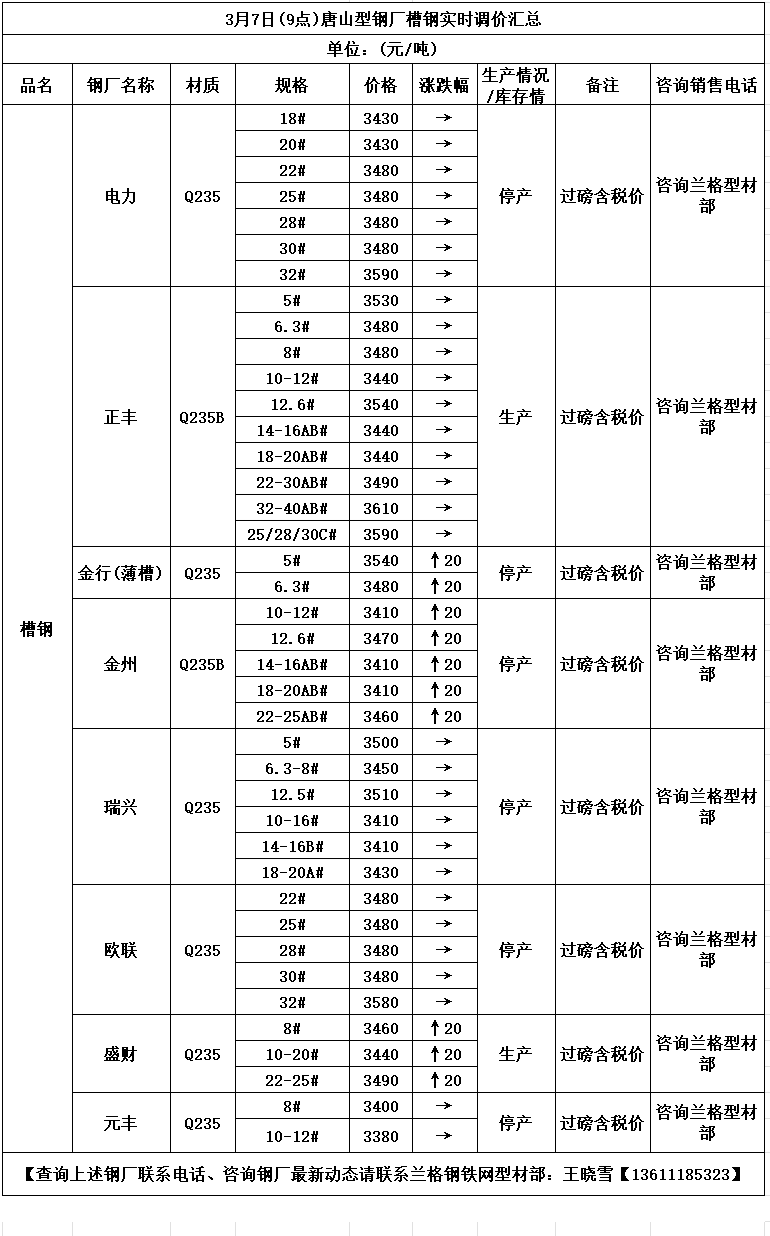 • 3月7日(9点)唐山型钢厂槽钢实时调价汇总