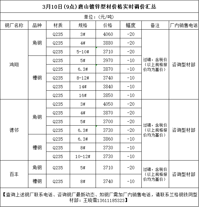 • 3月10日(9点)唐山型钢厂角钢实时调价汇总