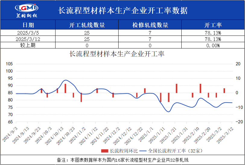 截至3月12日16:00,兰格钢铁网统计国内16家长流程样本生产企业共32条型钢轧线,在产25条,停产7条,开工率为78.13%,较上周不变。