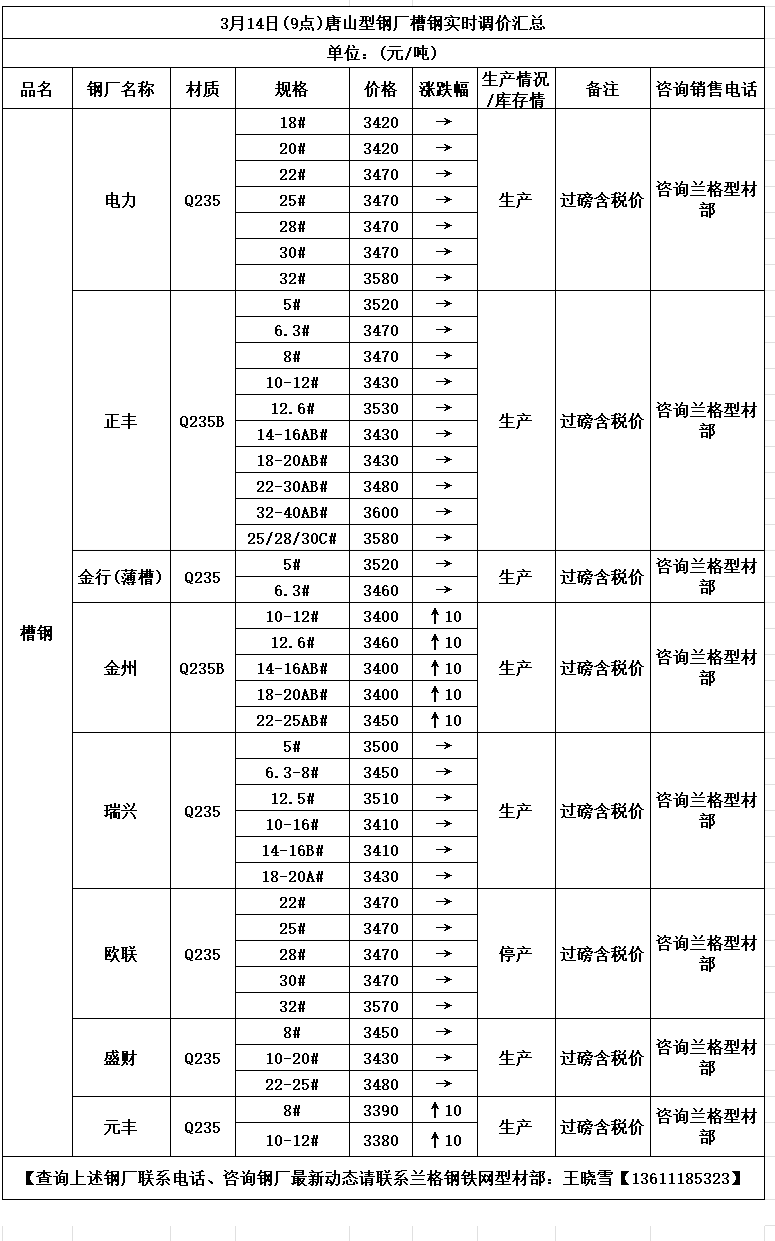 • 3月14日(9点)唐山型钢厂槽钢实时调价汇总