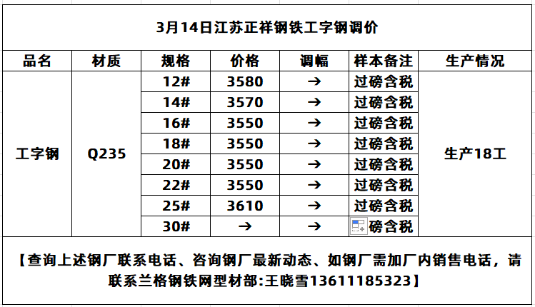 • 3月14日(9点)唐山型材钢厂工字钢实时调价汇总