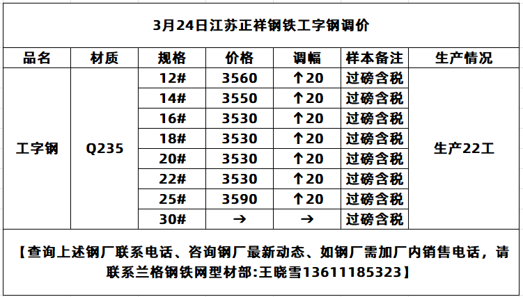 3月24日江苏正祥工字钢挂牌价较上周五上调20元