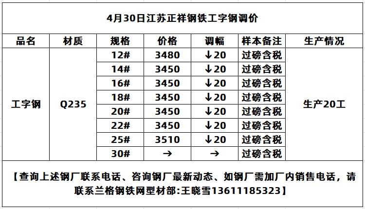 • 4月30日江苏正祥工字钢挂牌价下调20元