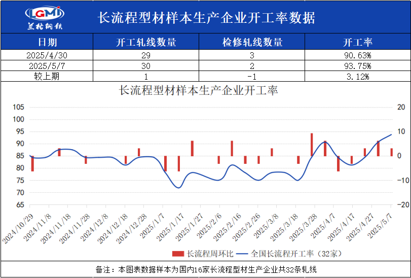 截至5月7日16:00,兰格钢铁网统计国内16家长流程样本生产企业共32条型钢轧线,在产30条,停产2条,开工率为93.75%,较上周上升3.12%。