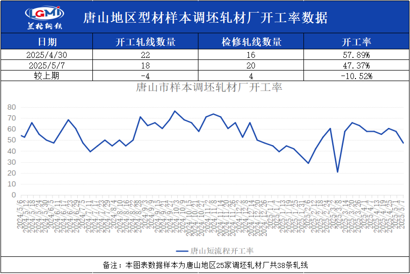 兰格钢铁网统计唐山24家样本轧钢企业共38条轧线,在产18条,停产20条,停产轧线数较上周增加4条,开工率为47.37%,较上周下降10.52%。