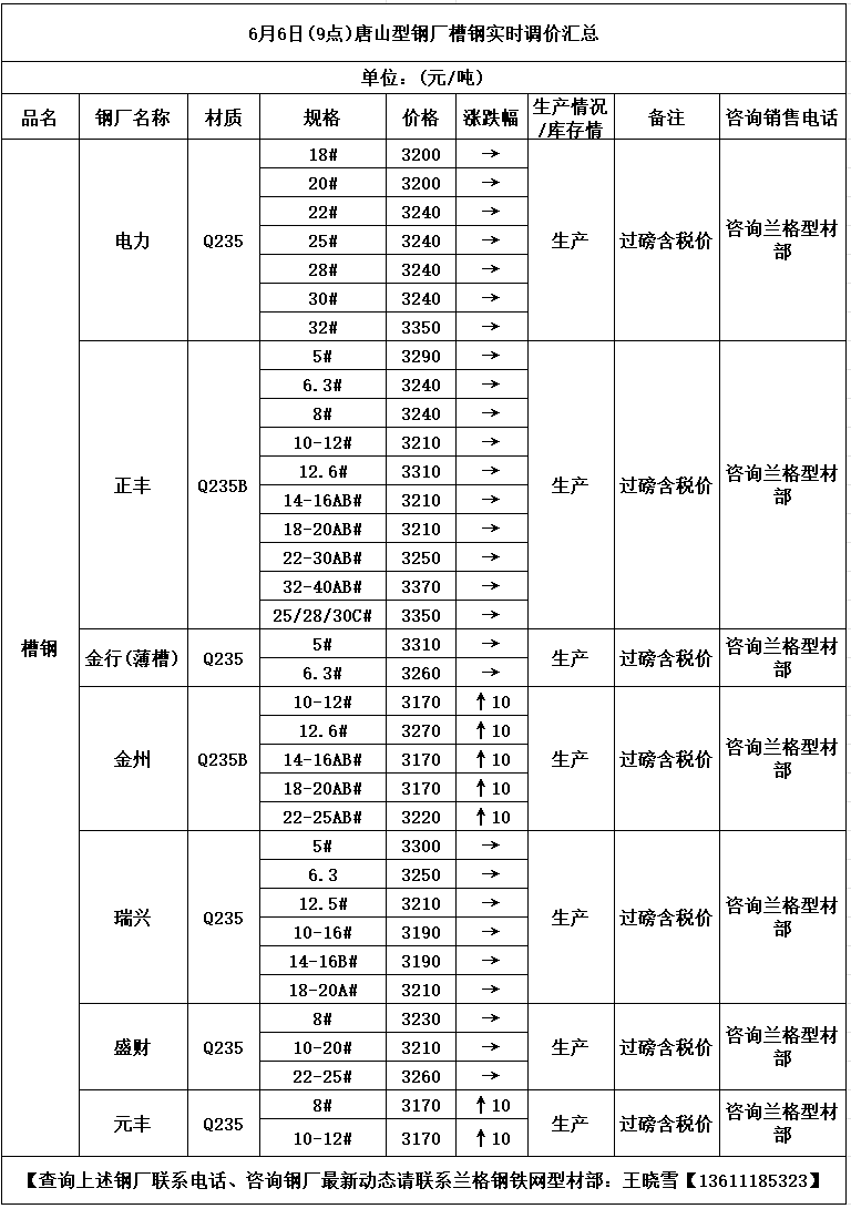 6月6日(9点)唐山型钢厂槽钢实时调价汇总