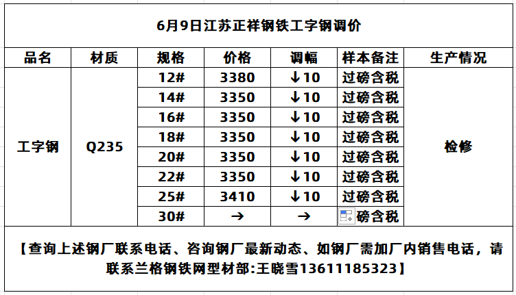 • 6月9日江苏正祥工字钢挂牌价较上周五下调10元