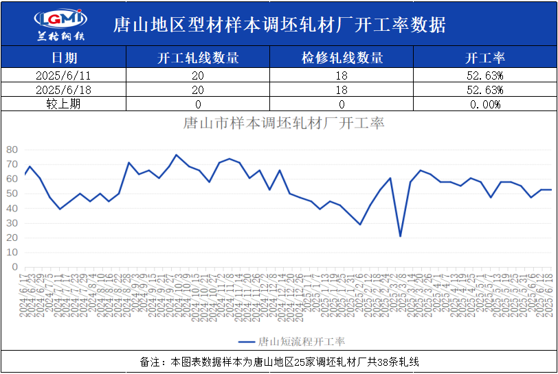 兰格钢铁网统计唐山24家样本轧钢企业共38条轧线,在产20条,停产18条,停产轧线数较上周不变,开工率为52.63%,较上周不变。