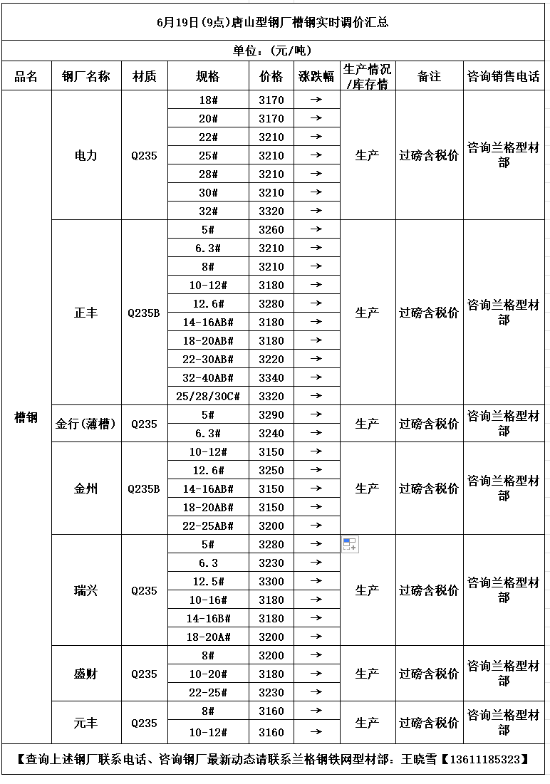 • 6月19日(9点)唐山型钢厂槽钢实时调价汇总
