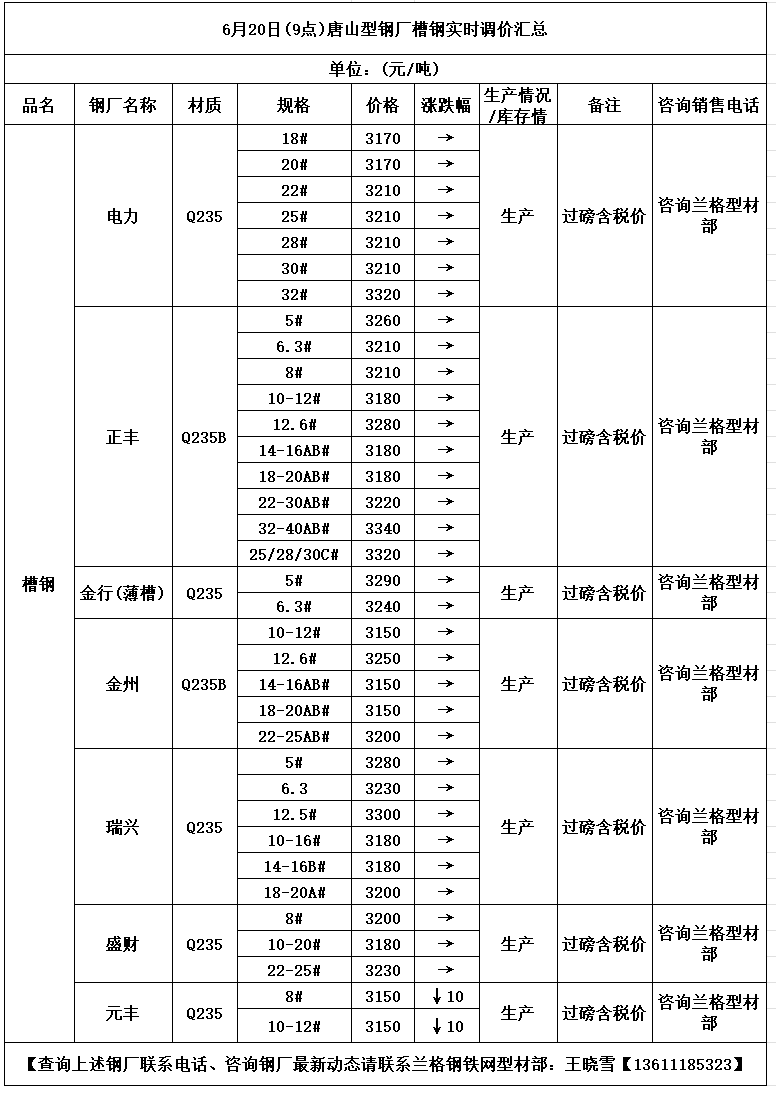 • 6月20日唐山元丰钢厂槽钢调价信息