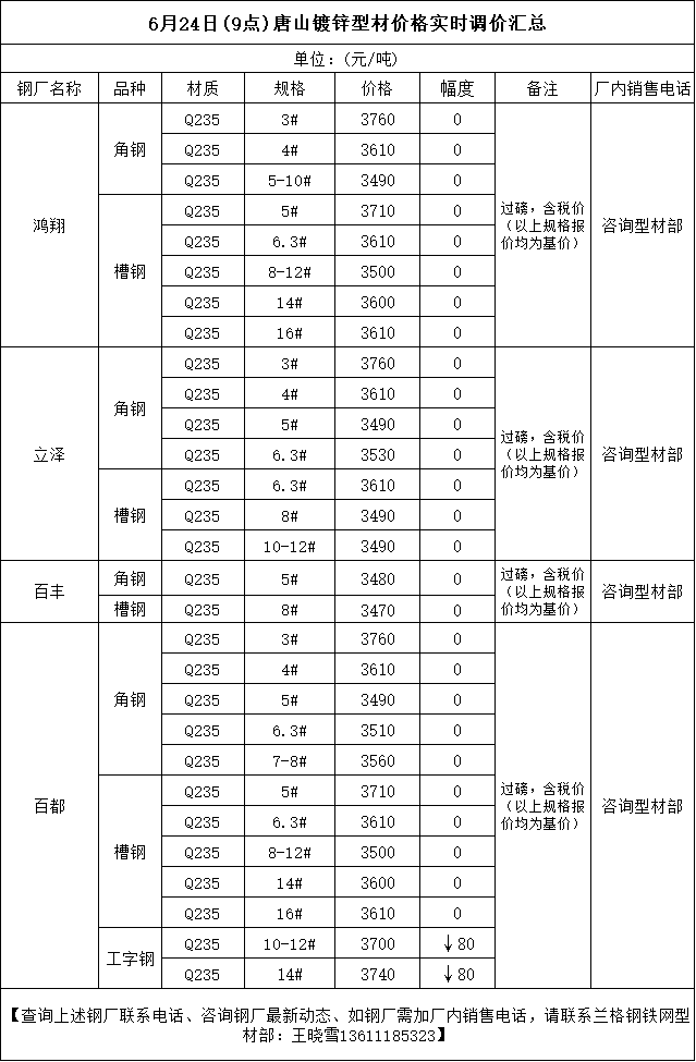 • 6月24日(9点)唐山型钢厂角钢实时调价汇总