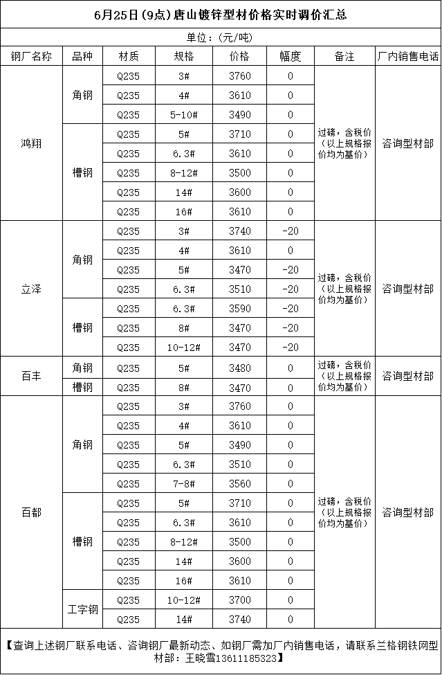 • 6月25日(9点)唐山型钢厂角钢实时调价汇总