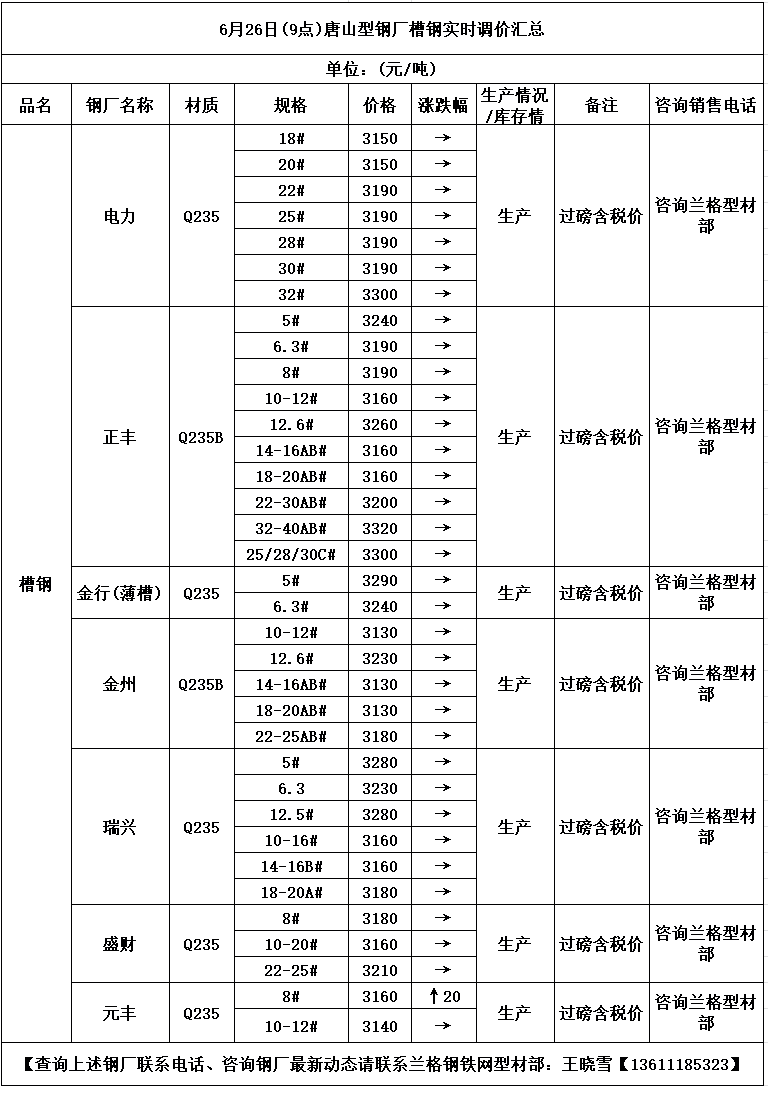 • 6月26日唐山元丰钢厂槽钢调价信息