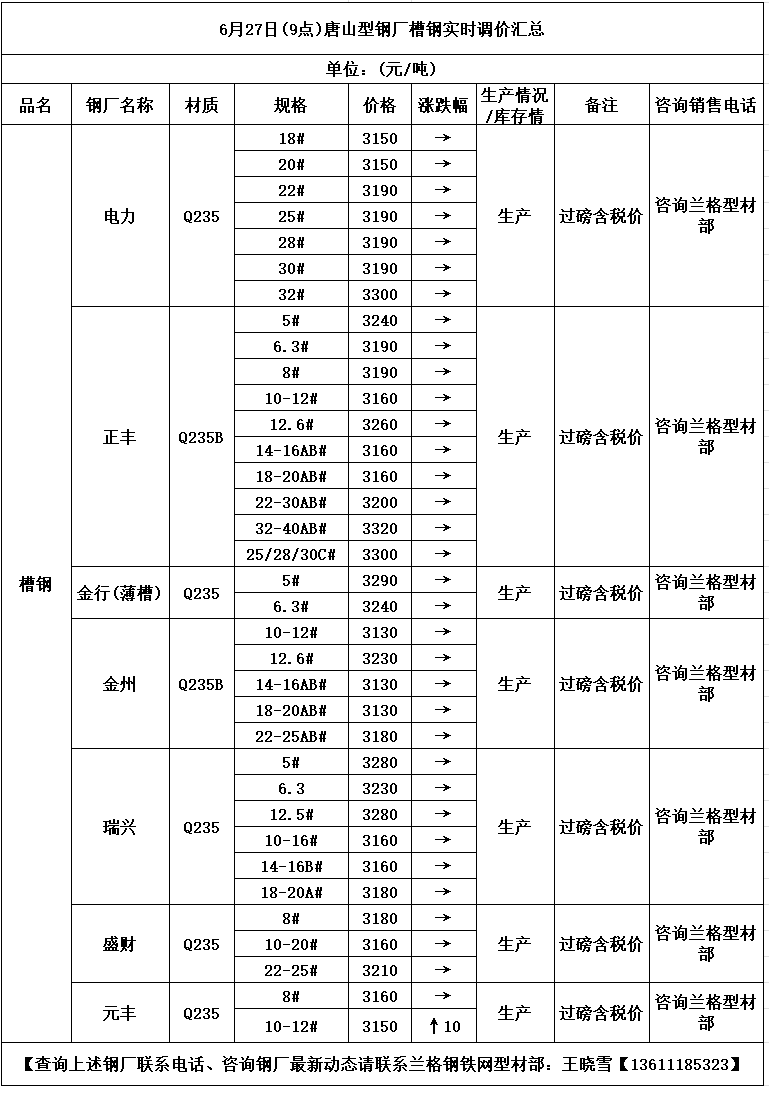 • 6月27日(9点)唐山型钢厂槽钢实时调价汇总