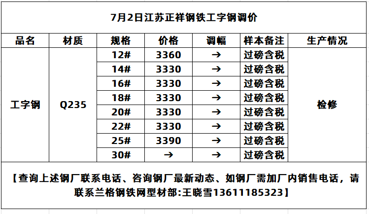 • 7月2日江苏正祥工字钢挂牌价维稳