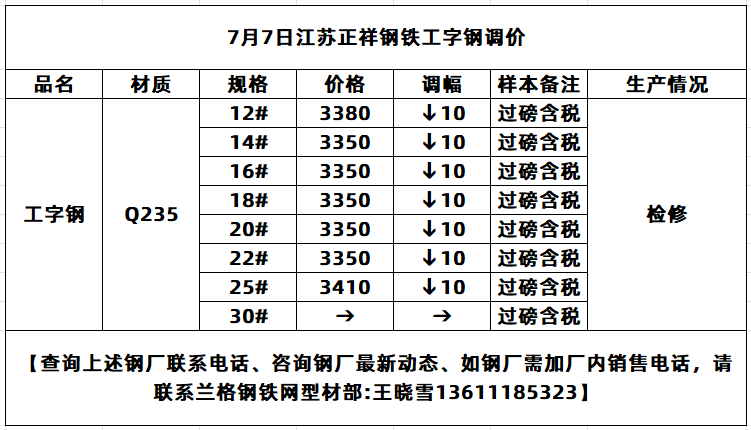 7月7日江苏正祥工字钢挂牌价较上周五下调10元
