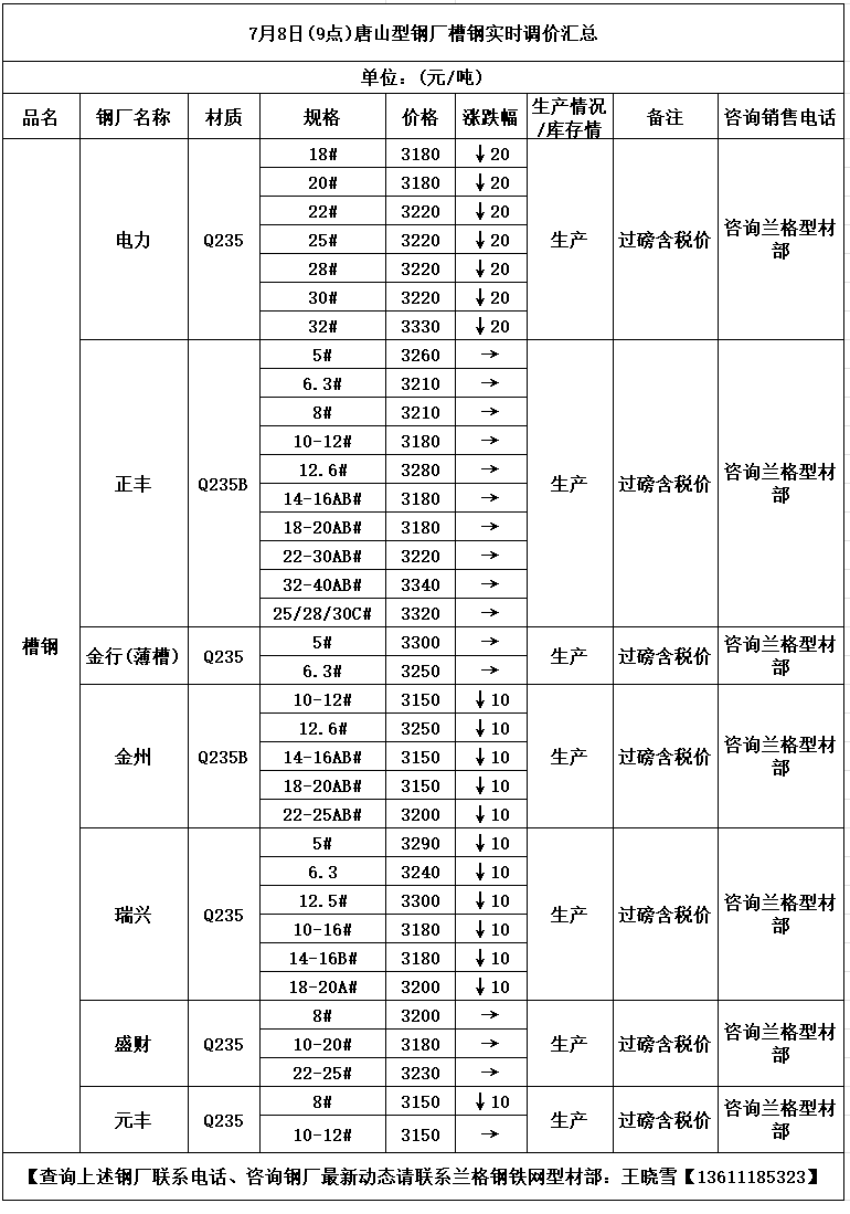 • 7月8日(9点)唐山型钢厂槽钢实时调价汇总