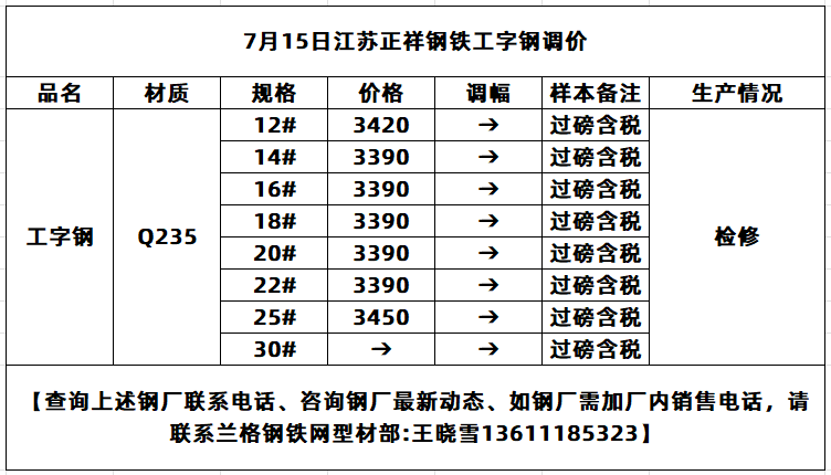 7月15日江苏正祥工字钢挂牌价持稳