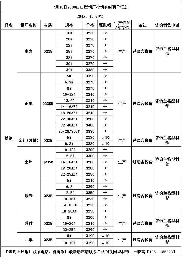 • 7月16日唐山元丰钢厂槽钢调价信息
