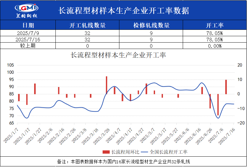 截至7月16日16:00,兰格钢铁网统计国内21家长流程样本生产企业共41条型钢轧线,在产32条,停产9条,开工率为78.05%,较上周维持不变。