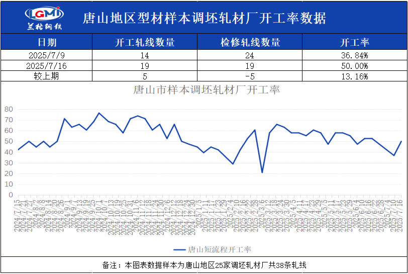兰格钢铁网统计唐山24家样本轧钢企业共38条轧线,在产19条,停产19条,停产轧线数较上周减少5条,开工率为50.0%,较上周上升13.16%。
