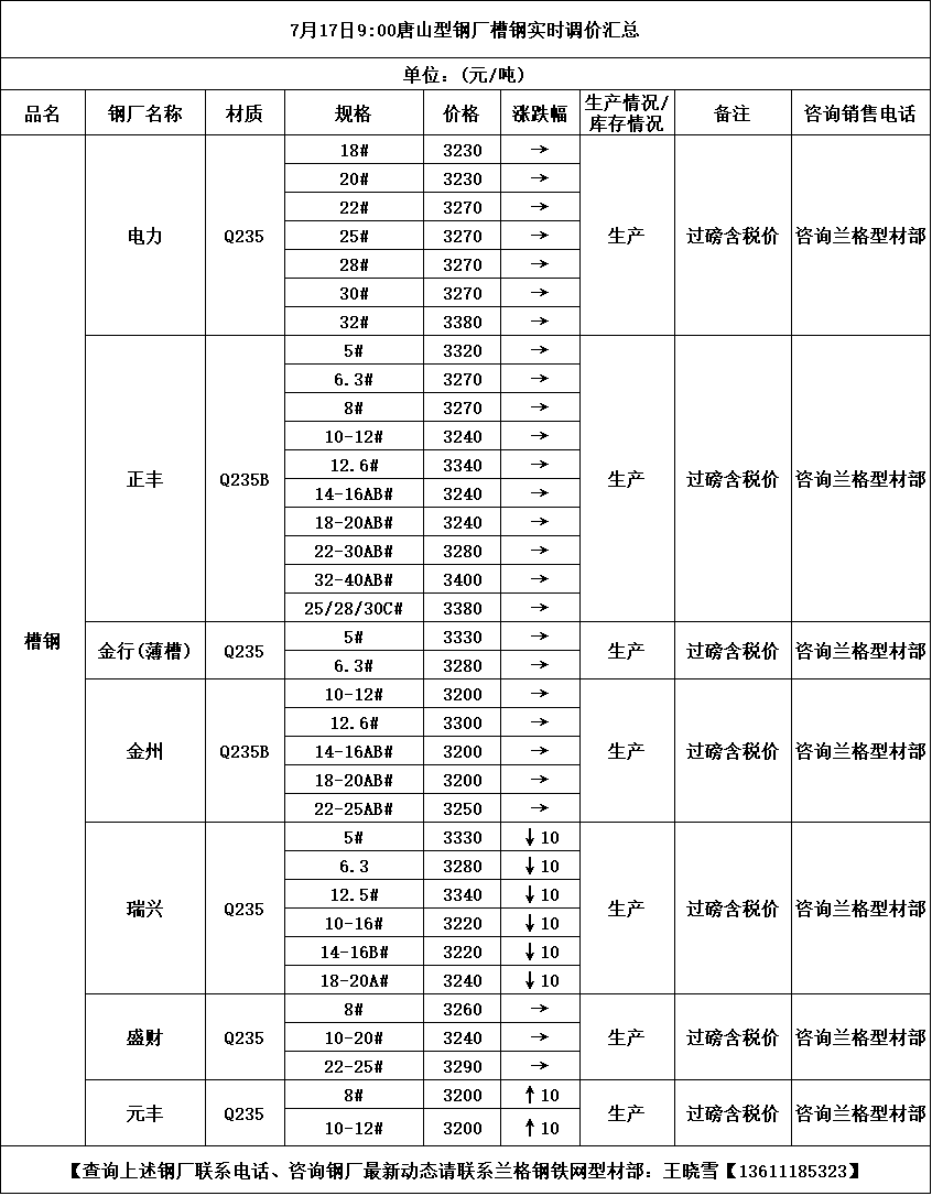 • 7月17日唐山正丰钢厂槽钢调价信息