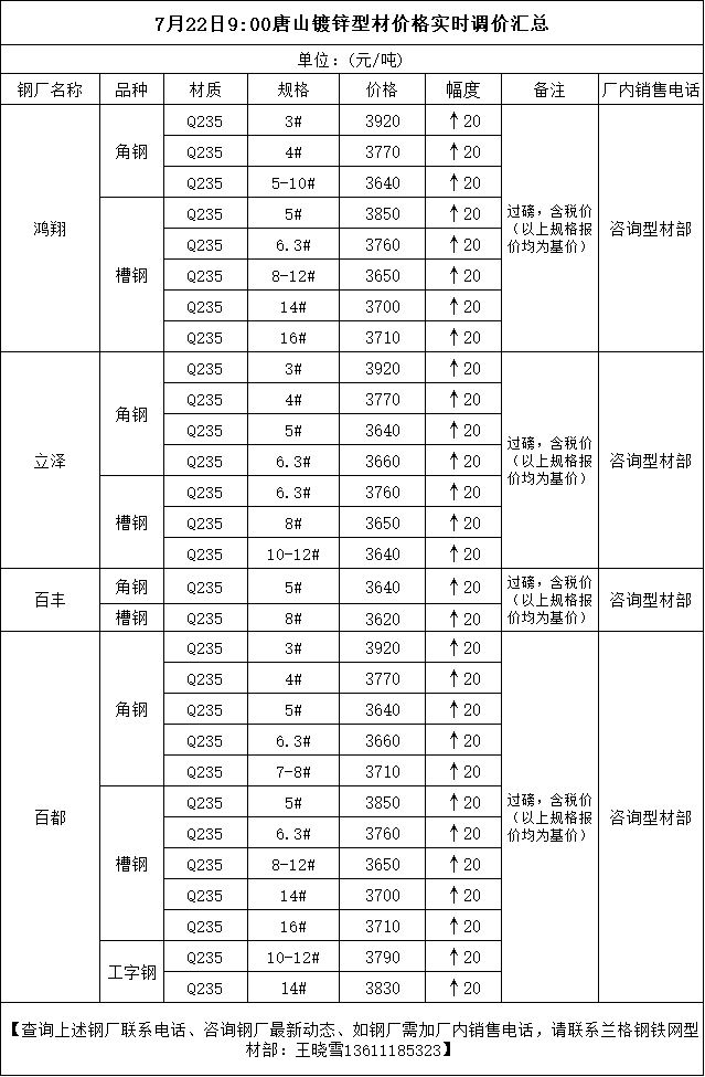 7月22日9:00唐山镀锌型材价格实时调价汇总