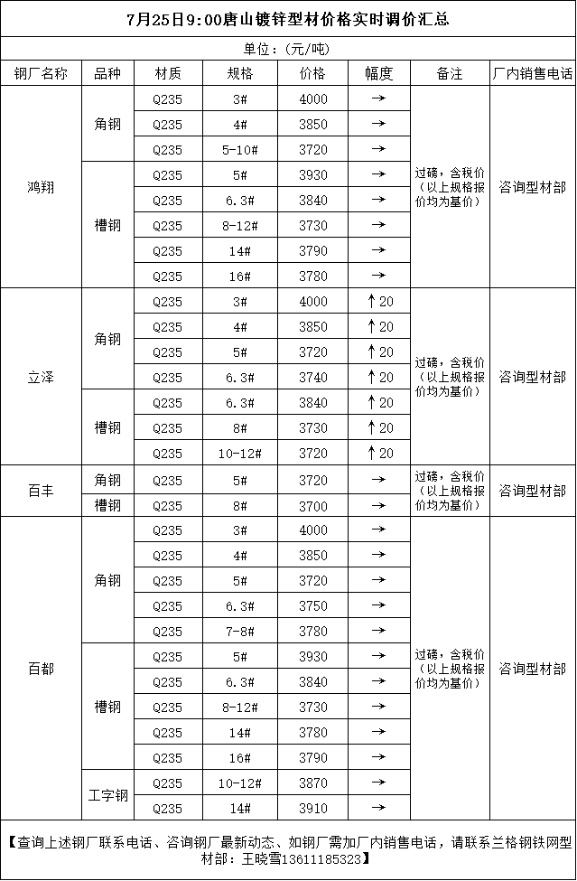 • 7月25日9:00唐山型钢厂角钢实时调价汇总