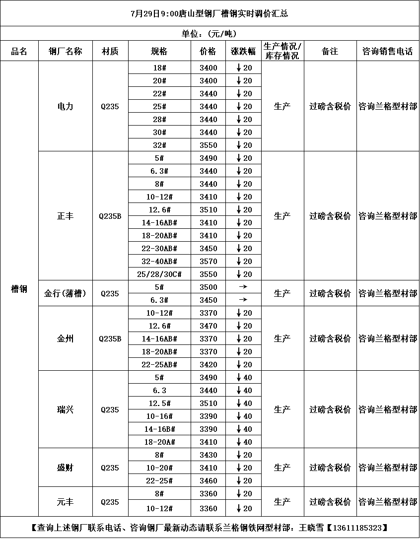 • 7月29日唐山元丰钢厂槽钢调价信息