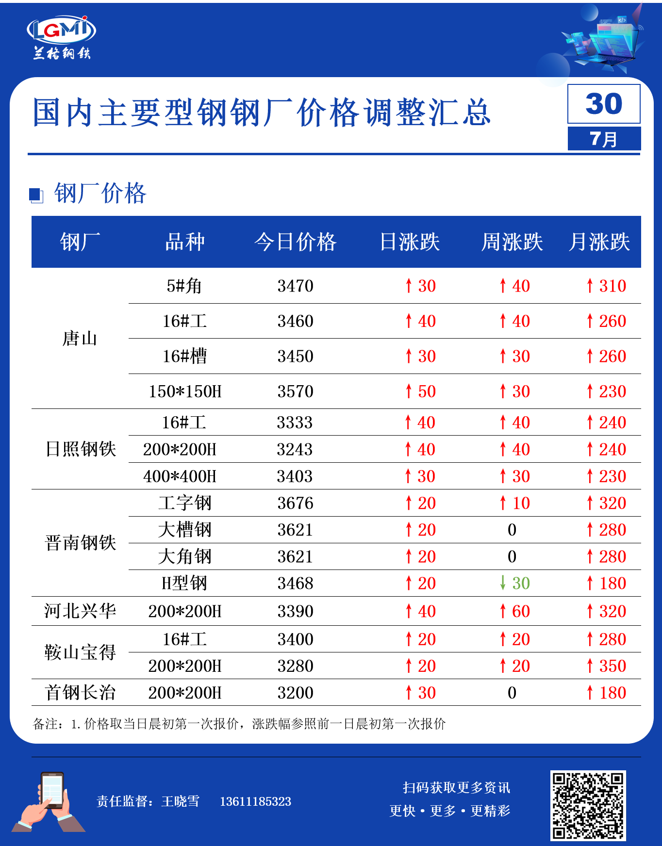 • 7月30日9:00唐山型钢厂角钢实时调价汇总