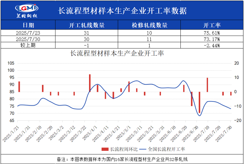 截至7月30日16:00,兰格钢铁网统计国内21家长流程样本生产企业共41条型钢轧线,在产30条,停产11条,开工率为73.17%,较上周下降2.44%。