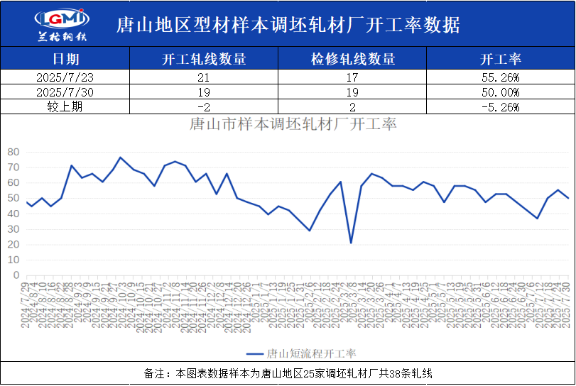 兰格钢铁网统计唐山24家样本轧钢企业共38条轧线,在产19条,停产19条,停产轧线数较上周增加2条,开工率为50.0%,较上周下降5.26%。