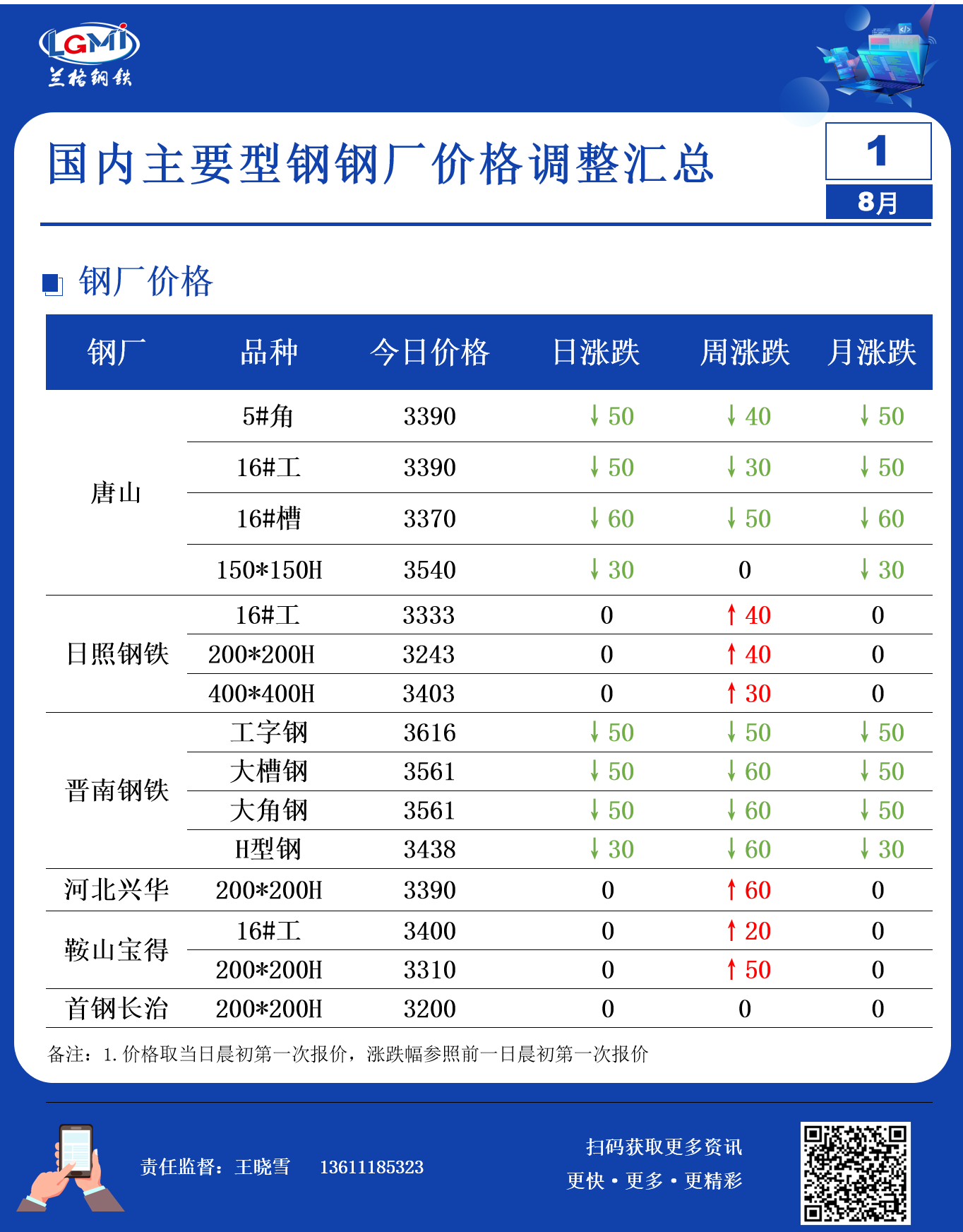 8月1日型钢钢厂调价汇总