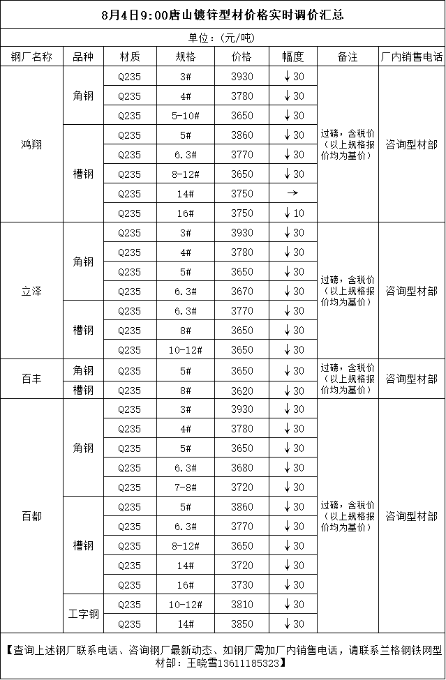 • 8月4日唐山龙翔钢厂角钢出厂价格下调30-60元