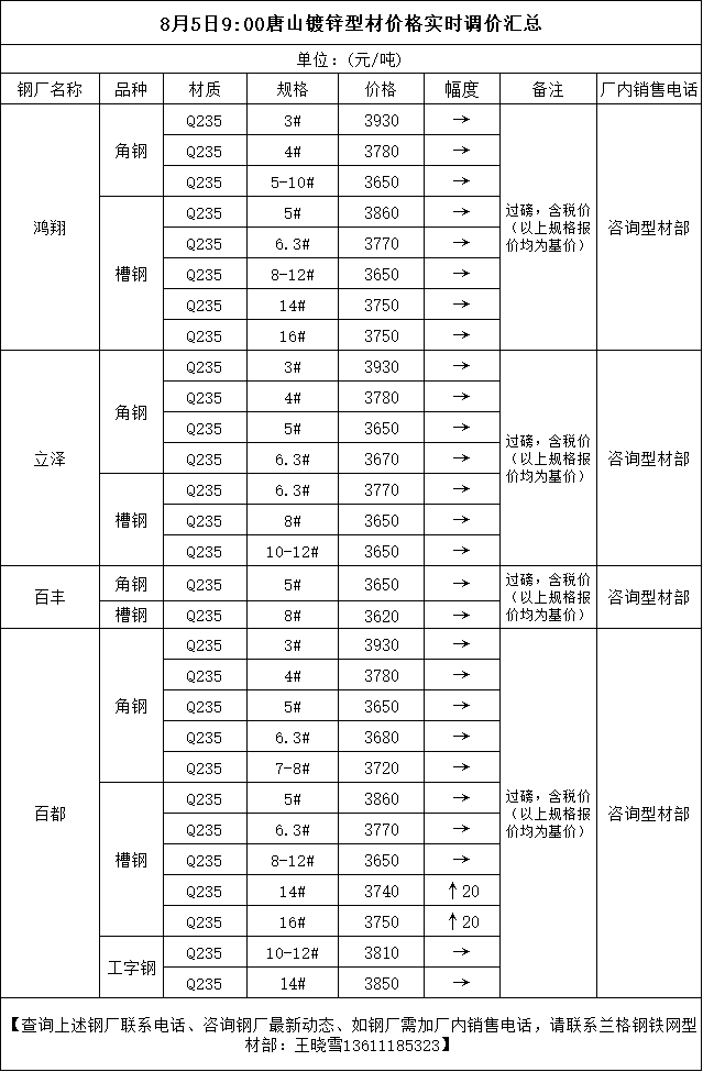 8月5日9:00唐山镀锌型材价格实时调价汇总