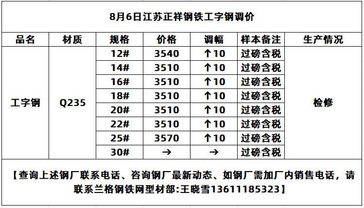 8月6日江苏正祥工字钢挂牌价较昨日早盘上调10元