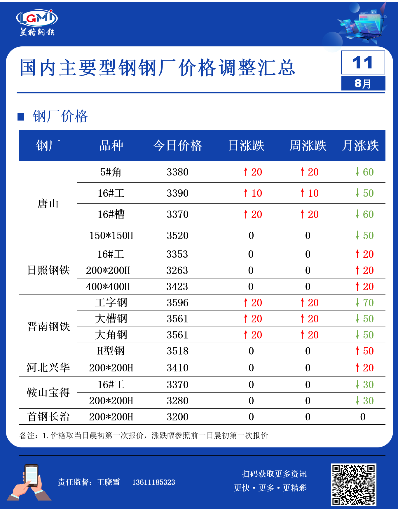 • 8月11日9:00唐山型钢厂角钢实时调价汇总